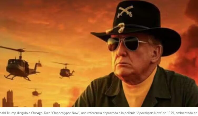 Basta con considerar una de sus publicaciones más recientes en las redes sociales. En ella, Trump generó un meme que lo representa con uniforme militar y un sombrero de infantería con fusiles cruzados con una explosión de llamas detrás de él, cinco helicópteros militares flanqueando su lado derecho y el horizonte de Chicago bajo un cielo ominoso de fondo.